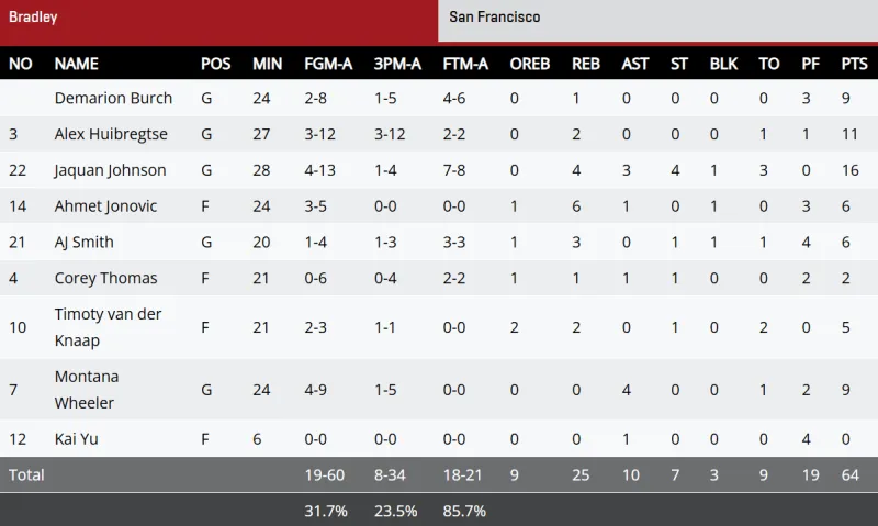 虎撲11月16日訊 今日NCAA常規賽:舊金山大學(xué)75-64戰勝布拉德利大學(xué)。