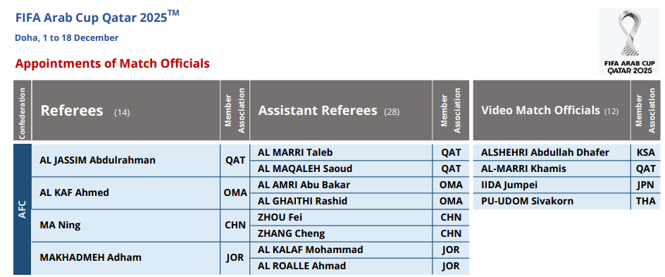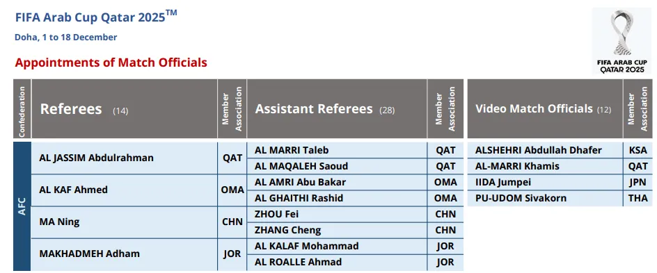 國際足聯(lián)共選派14組裁判員(含主裁判及助理裁判員)、12名視頻比賽官員(VAR)參加本屆阿拉伯杯的執法。其中亞足聯(lián)共有4組裁判員獲選派參與本屆賽事執法,包括來(lái)自中國的裁判員馬寧、助理裁判員周飛、張鋮。