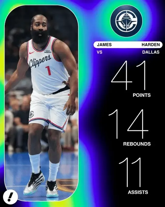 哈登全場(chǎng)出場(chǎng) 51 分鐘(總共 58 分鐘)拿下入場(chǎng)最高的 41 分,25 投 13 中,三分 12 投 6 中,還送出 14 籃板 11 助攻大號三雙,同時(shí)防守端有 2 次封蓋 1 次搶斷。