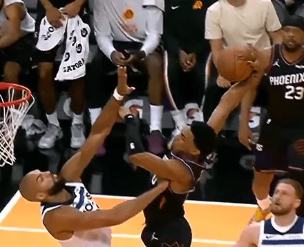 第四節比賽,遭干鄧恩單臂隔扣戈貝爾遭干擾扣飛,擾扣隨后失衡重摔倒地。飛隨
