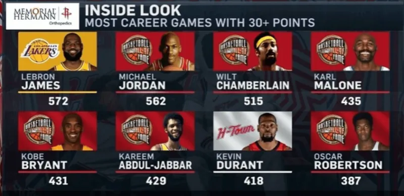 賽中,轉播方曬出歷史30+場(chǎng)次排名,具體如下:
