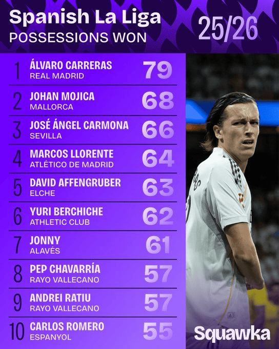 虎撲11月11日訊 Squawka統計,截至目前西甲本賽季奪回球權次數排名。球權