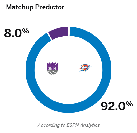 賽前,日雷美媒ESPN預測本場(chǎng)比賽,霆v霆勝雷霆勝率高達92.0%,王比國王勝率為8.0%。賽雷? ?