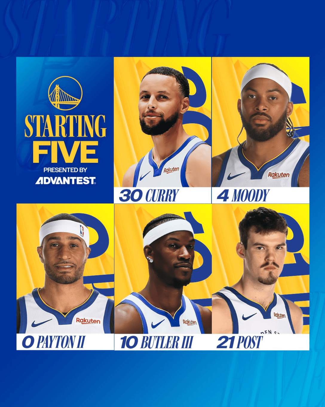 勇士首發(fā):庫里、發(fā)庫穆迪、佩頓小佩頓、巴特勒、波斯特