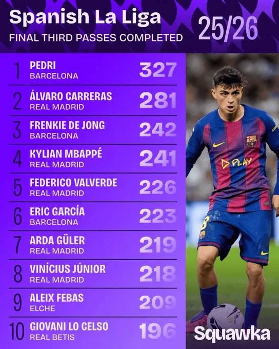 西甲本賽季進(jìn)攻三區傳球成功次數榜:
