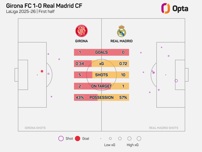 [流言板]皇馬上半場(chǎng)僅1次射正,為本賽季各項賽事客場(chǎng)比賽上半場(chǎng)最少
