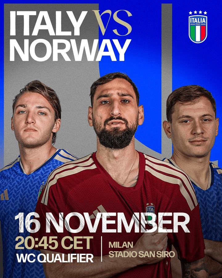 賽前,意大利官方發(fā)布了賽事預告海報,多納魯馬、巴雷拉和雷特吉聯(lián)袂出鏡。兩隊的凈勝球差距有17個(gè),因此意大利在這場(chǎng)比賽的凈勝球必須達到9個(gè)或更多,才能實(shí)現超越挪威,獲得世界杯的直通資格。