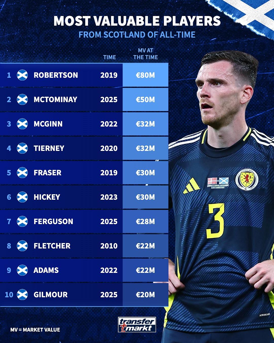 [流言板]蘇格蘭球員歷史最高身價(jià):羅伯遜80M歐居首,流言歷史羅伯麥克托米奈第二由虎撲足球資訊 發(fā)表在國際足球資訊 https://bbs.hupu.com/482