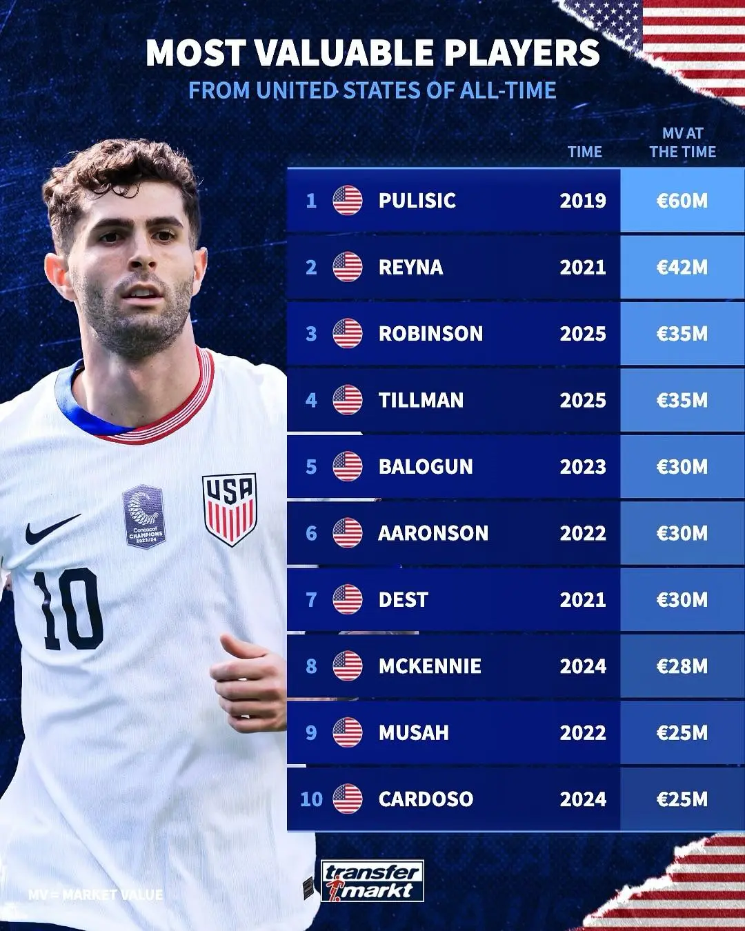 虎撲11月16日訊 德國轉會(huì )市場(chǎng)統計了美國球員的歷史最高身價(jià),詳情如下: